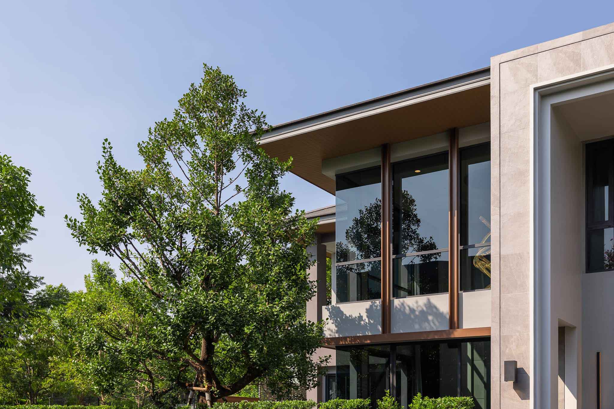บ้านหลังนี้เลือกใช้กระจกตัดแสงสีเทาเข้มเพื่อลดความร้อน และใช้ Solar Cell เพื่อลดค่าไฟ แต่ก็ยังไม่เพียงพอต่อสภาพอากาศในประเทศไทย จึงเลือกติดฟิล์มกรองแสงลดความร้อนจาก SEACLEAR เพื่อให้บ้านเย็นสบายและประหยัดพลังงานมากยิ่งขึ้น
