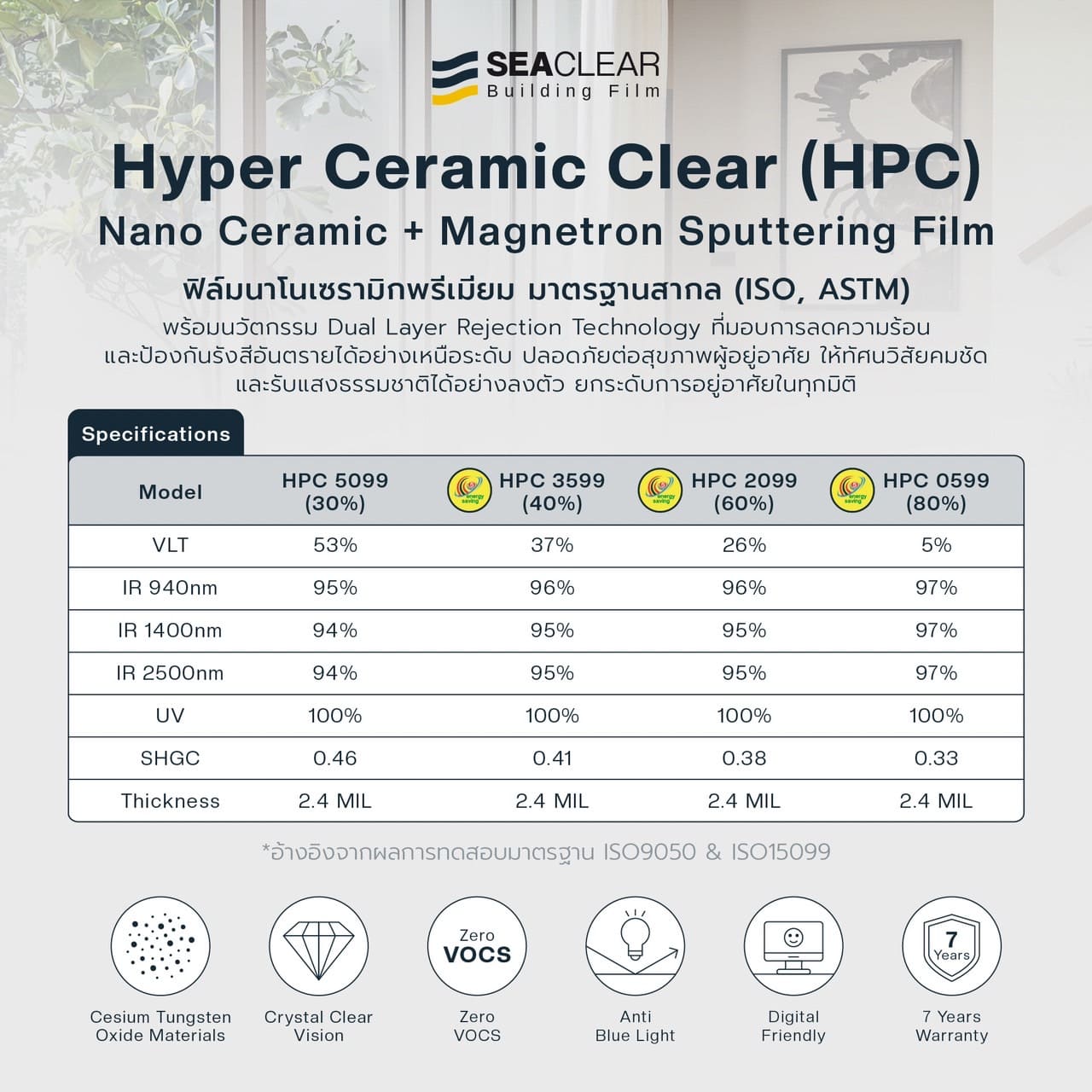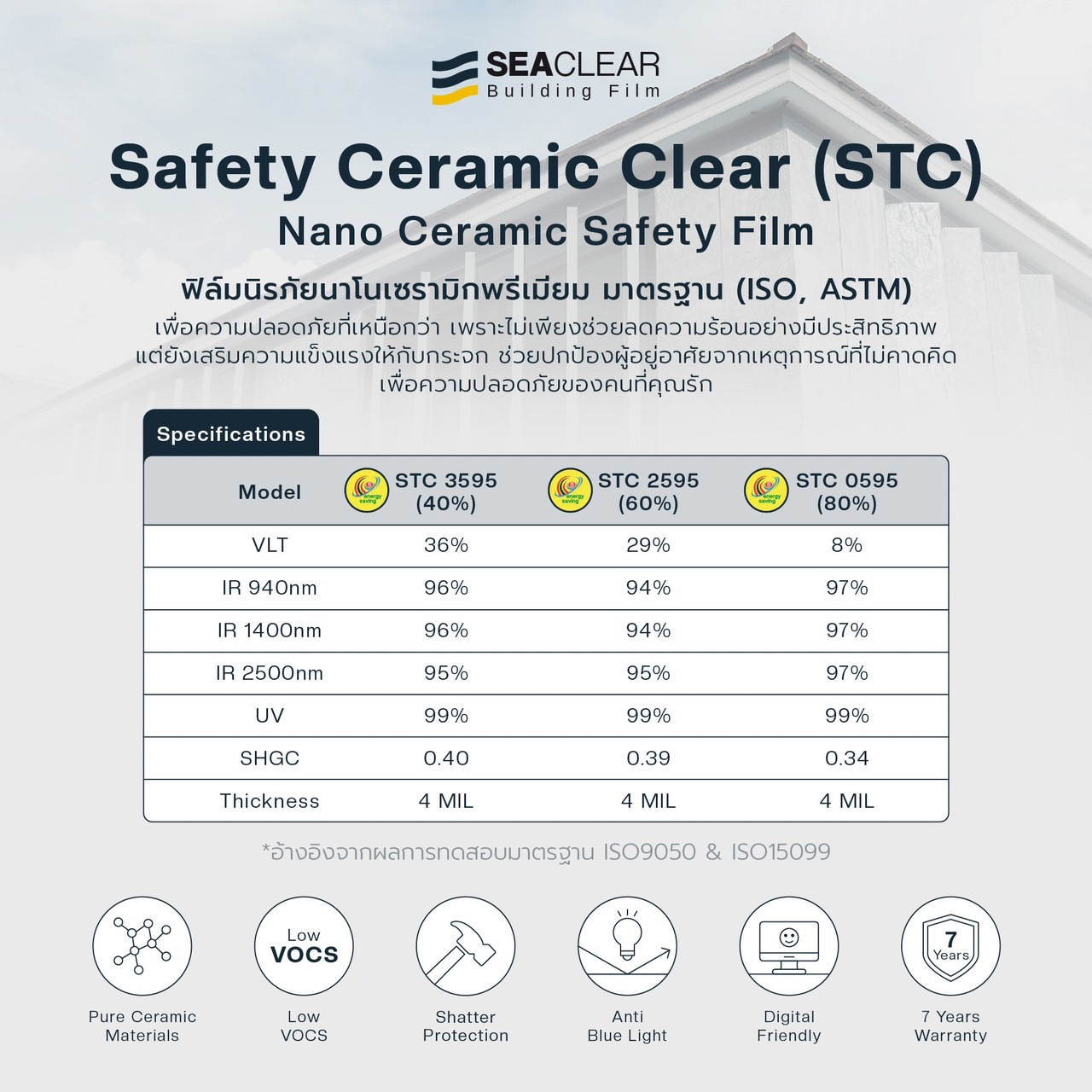 SEACLEAR นวัตกรรมฟิล์มกรองแสงที่ได้รับการพัฒนาให้เหมาะกับสภาพอากาศในประเทศไทย ด้วยความสามารถในการลดความร้อนภายในอาคารได้มากกว่าฟิล์มทั่วไปถึง 3 เท่า SEACLEAR ช่วยให้คุณสัมผัสความเย็นสบายภายในอาคาร พร้อมประหยัดพลังงานอย่างมีประสิทธิภาพ
